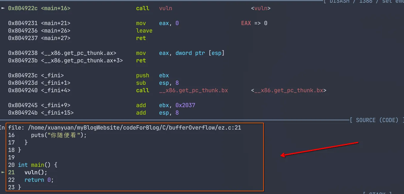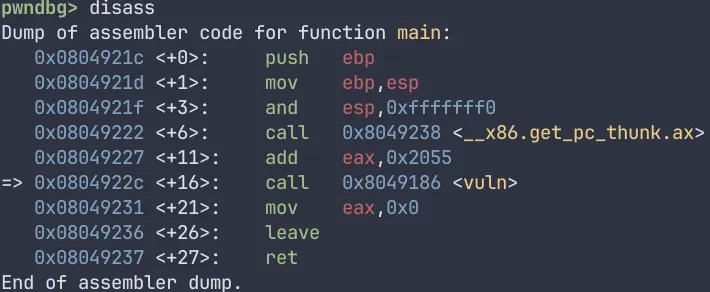 我们可以看到,下一步该执行call vuln了,我们使用si命令步入vuln函数
